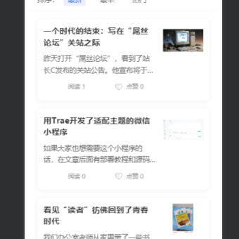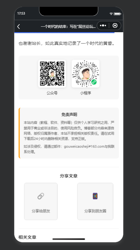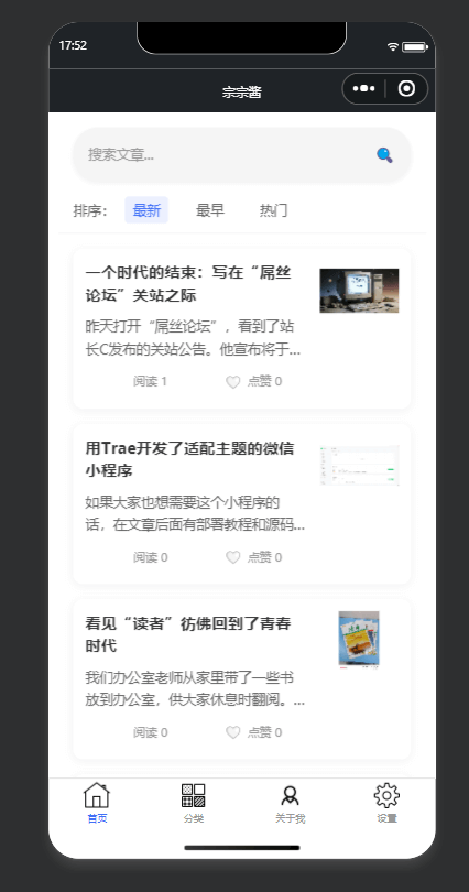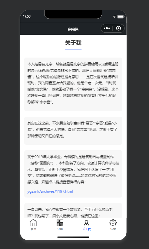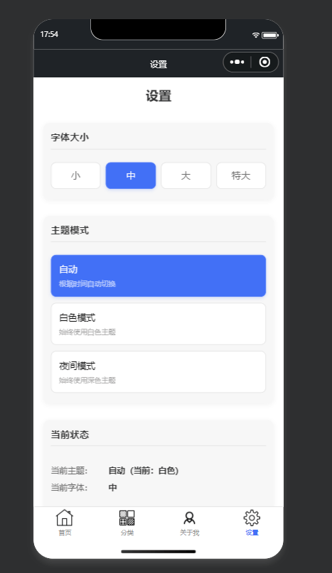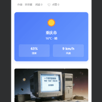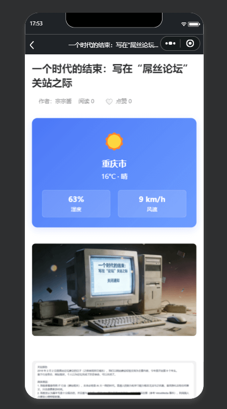首页: 内容页: 文章底部: 关于我页面: 新增设置页面: 一、核心功能优化 1. 性能优化 图片懒加载 :所有图片添加 lazyload="{{true}}"…