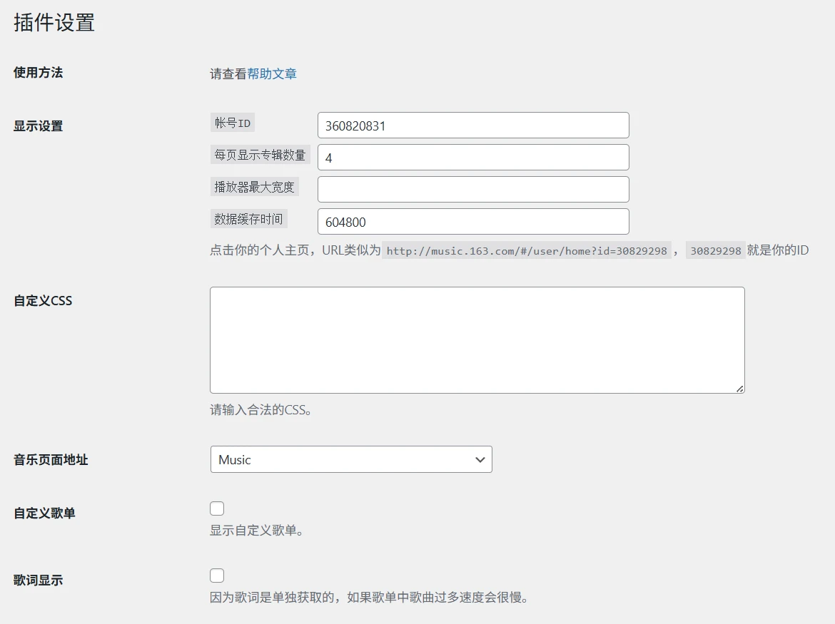 后台 > 设置 > 网易云音乐设置,进入插件设置页面: