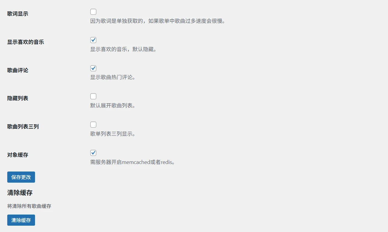 - 请根据需要自行设置音乐缓存时间。如开启了歌词显示可设置较长的缓存时间并自己提前加载缓存好,免去访客长时间的等待。