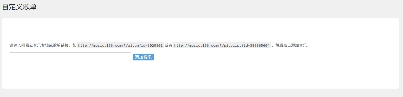 我想做一个歌单展示页面,展示收藏我自己喜欢的音乐。之前的想法是自己把喜欢的歌曲下载下来后上传到服务器然后自己做个一个列表歌单出来,想了下就放弃了。第一是下载歌曲后上传到服务器要占磁盘空间,我这个小机器只有40G现在已经只剩下几个G的空间可用了。第二个是版权问题,如果是我自己做一个私密页面是可以的,但是公众能访问的页面就不能自己上传和存储到时候会带来不必要的麻烦。就去网上搜了下有没有WP的外链音乐插件,一搜索还真有,就是“netease music”这款插件,这款插件更新时间有点久远了。但是不妨碍它正常使用!