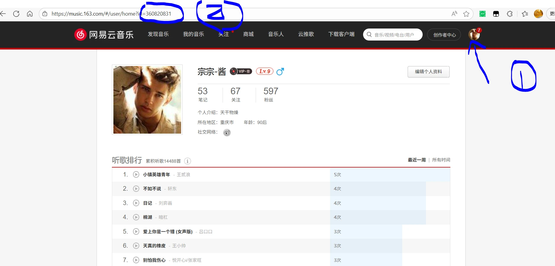这里面最主要的就是你的账号ID,这个ID如何获取了?登录网易云音乐的网页端然后点击头像有个我的主页然后顶部页面框最后就有个ID所示: