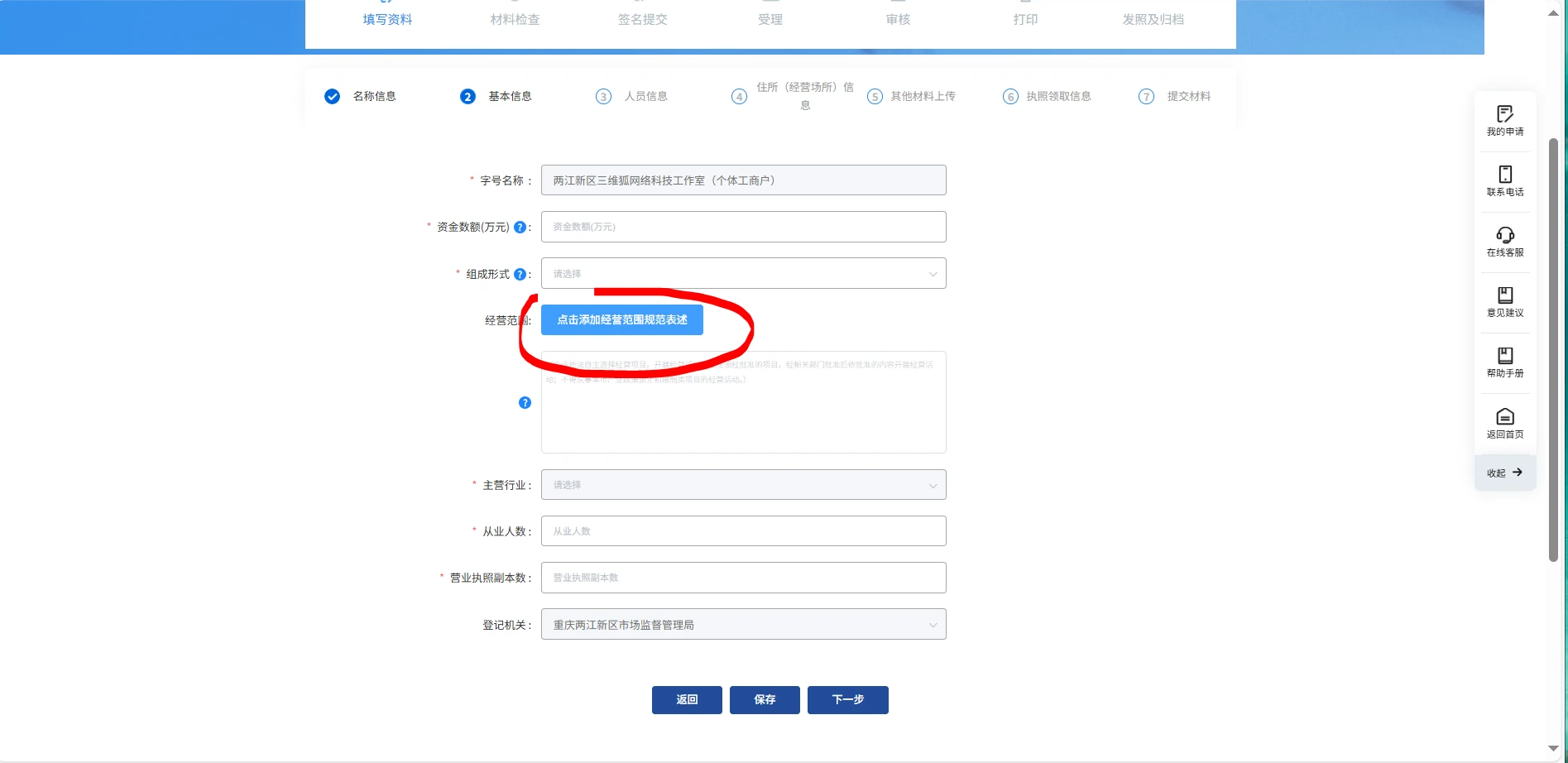 第十三步:填写基础信息,资金(这个建议写个1w或者0.1w就行,这个不会验资)、组成形式选择个人经营、从业人数、副本数等。然后填写自己的经营范围。