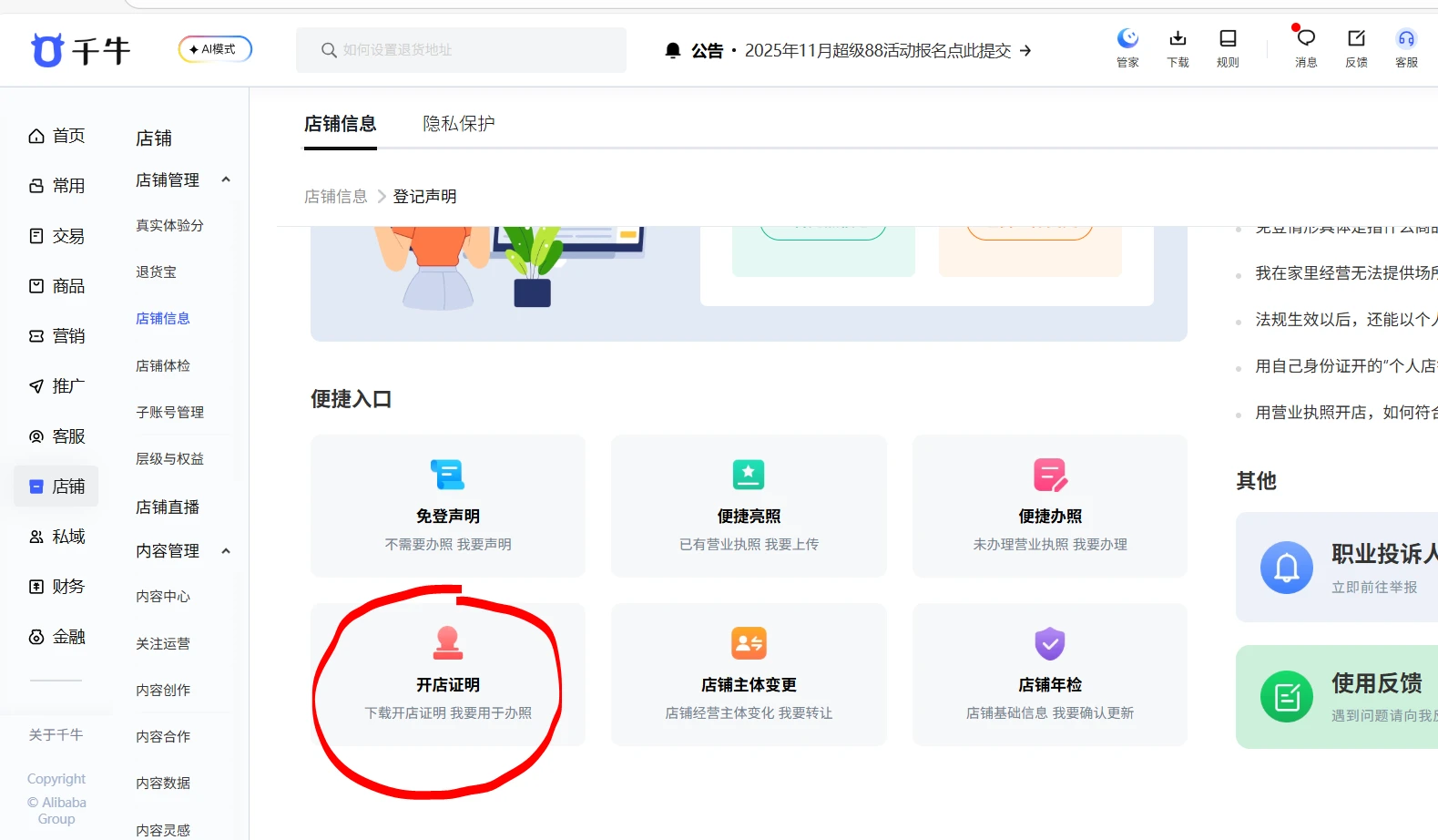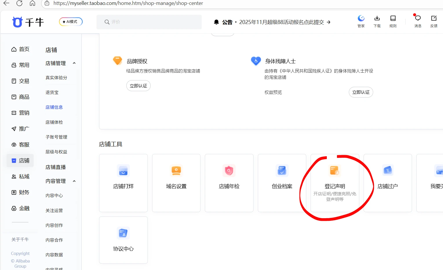 第十七步:淘宝开店证明,进入淘宝后台然后在档案中心找到以下位置。这里不懂的请直接留言!