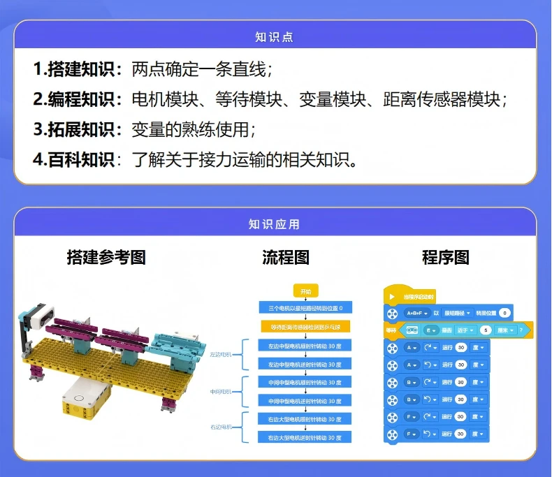 2编程知识:电机模块、等待模块、变量模块、距离传感器模块;