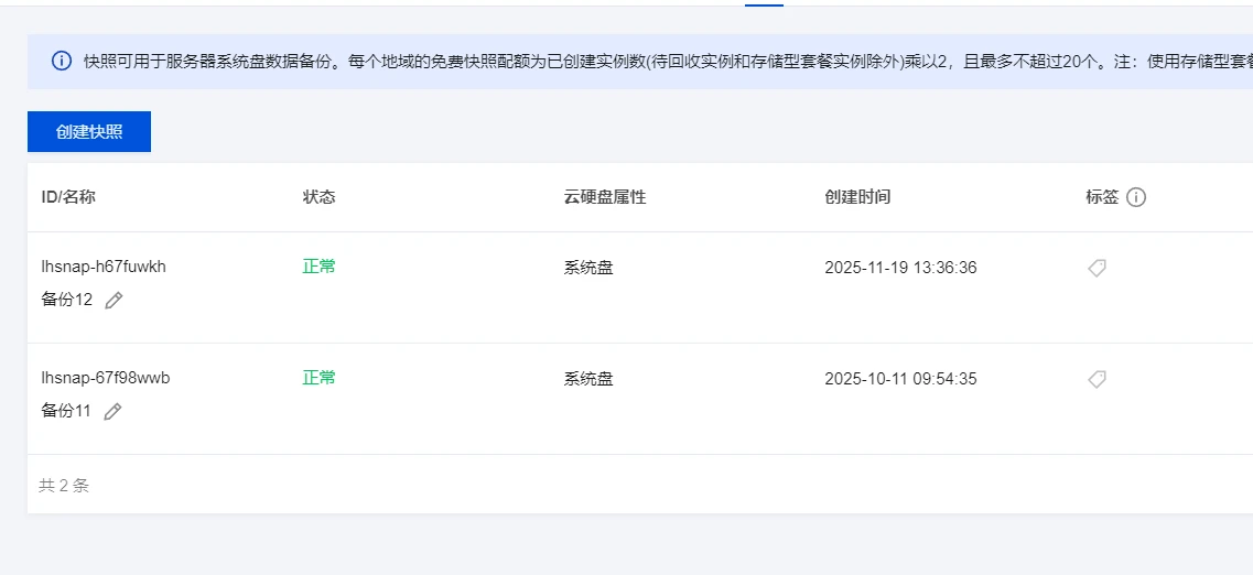 在看完旧服务器的安装的组件后,立即回到腾讯云为系统创建了一个快照,以防万一!