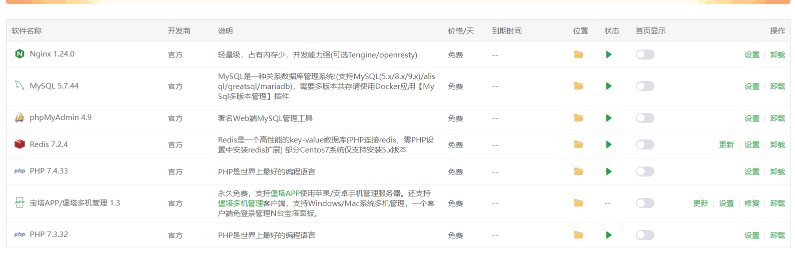 买完服务器之后了,我们就要安装宝塔面板,我系统环境直接选择的宝塔面板,就直接可以从服务器免密登录,然后绑定账号。把宝塔面板升级到最新版本。接下来就是到我们的旧服务器里面看下我们的运行环境,为啥要看运行环境?