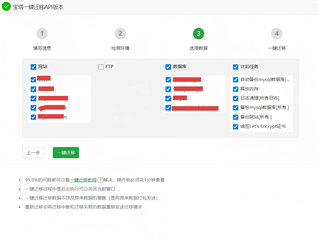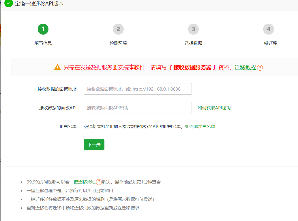 使用宝塔一件迁移,接收数据的服务器必须和原来的服务器的各个组件一致,版本号一直才行!否则是迁移不了的!