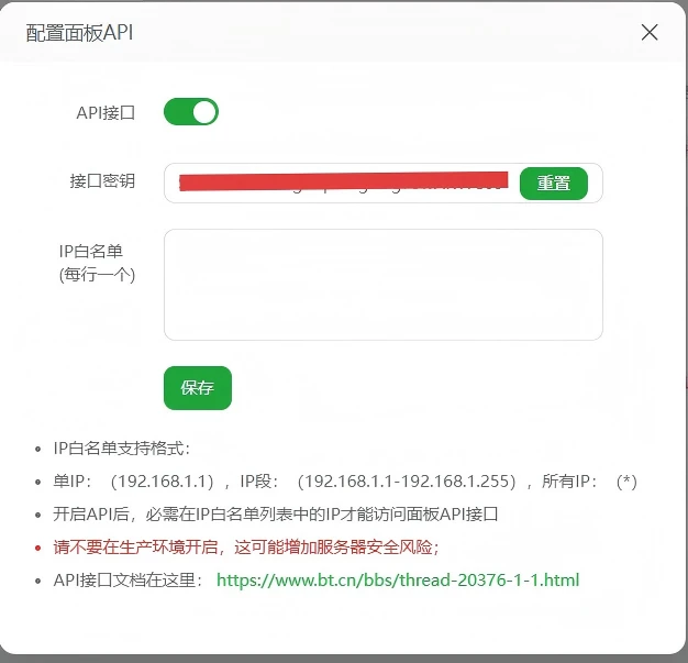 这里输入你新服务器的宝塔面板地址,然后在新服务器里面开启API,把你的旧服务器的IP加入到白名单里面。