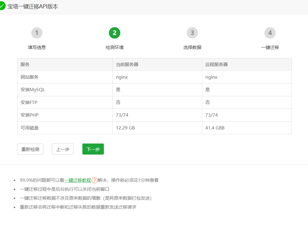 设置好以后,我们在旧服务器上面点击检测环境。然后看它给的提示,没有问题我们就点击下一步!