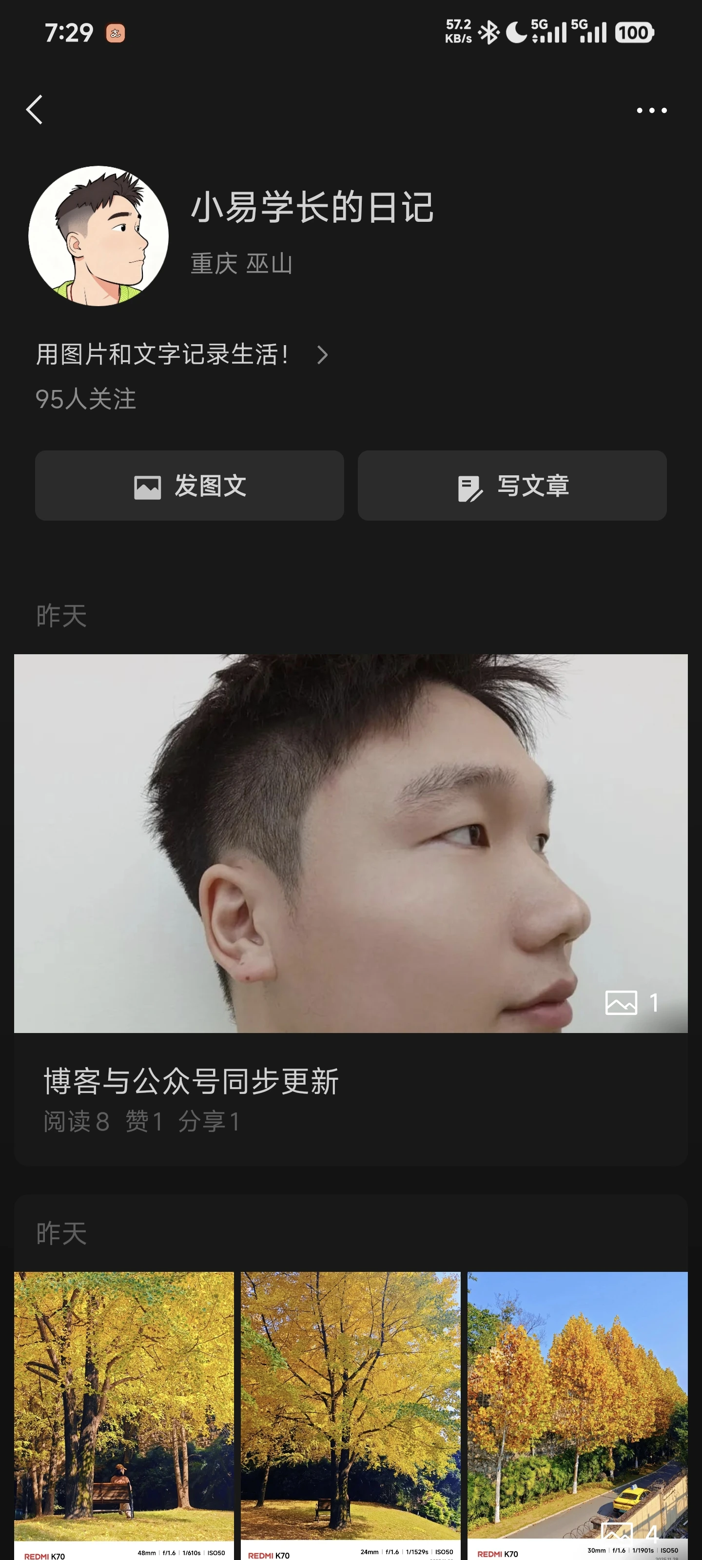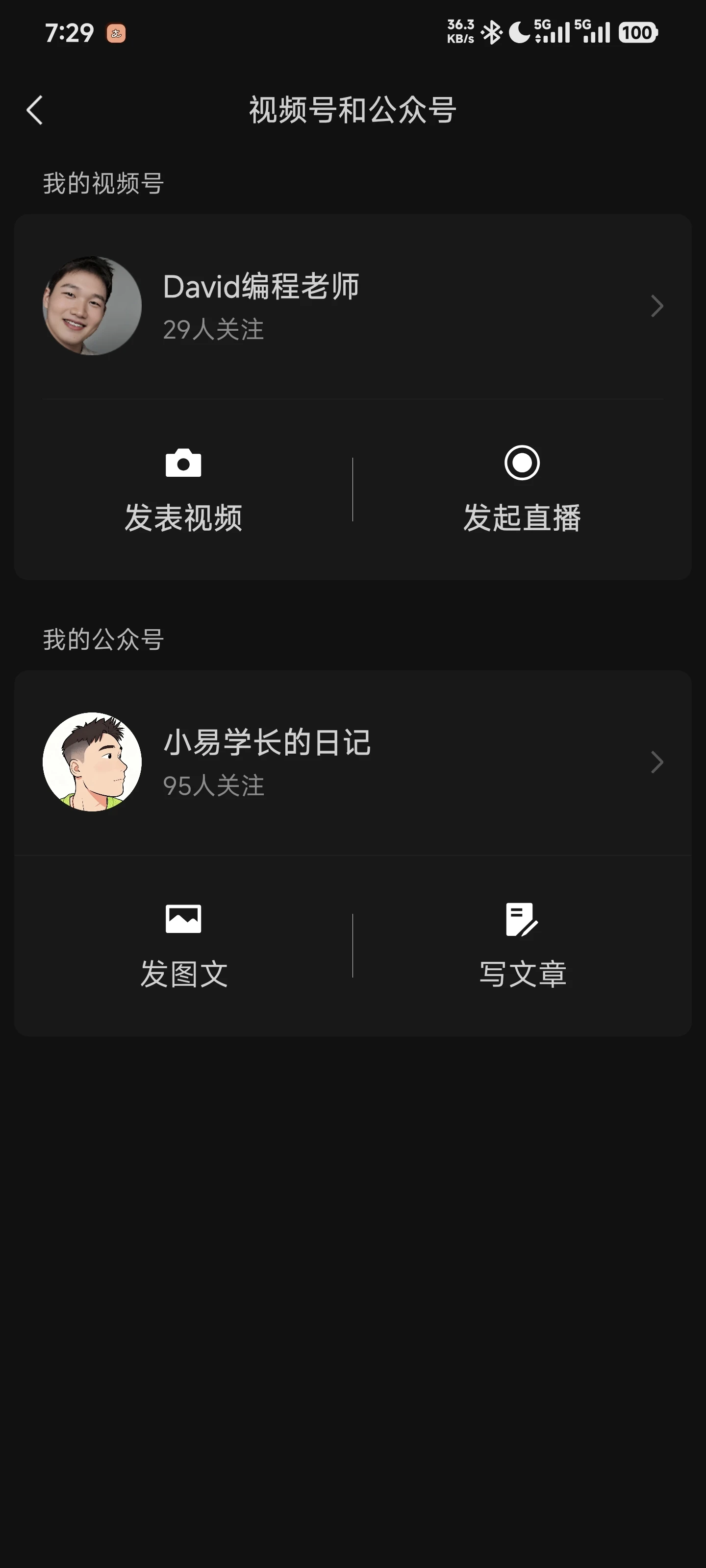 昨天晚上下班以后,捣鼓了一下微信界面。发现微信个人页面有视频号和微信公众号的板块。点击进去可以快速的发表文章或者图文。不像以前发表一张微信公众号的文章要跑到微信号公众平台上去发表。现在微信公众号可以像发表说说一样简单。这个微信公众号我2016年就注册了,就一直没有去更新过!大家可以去试试。