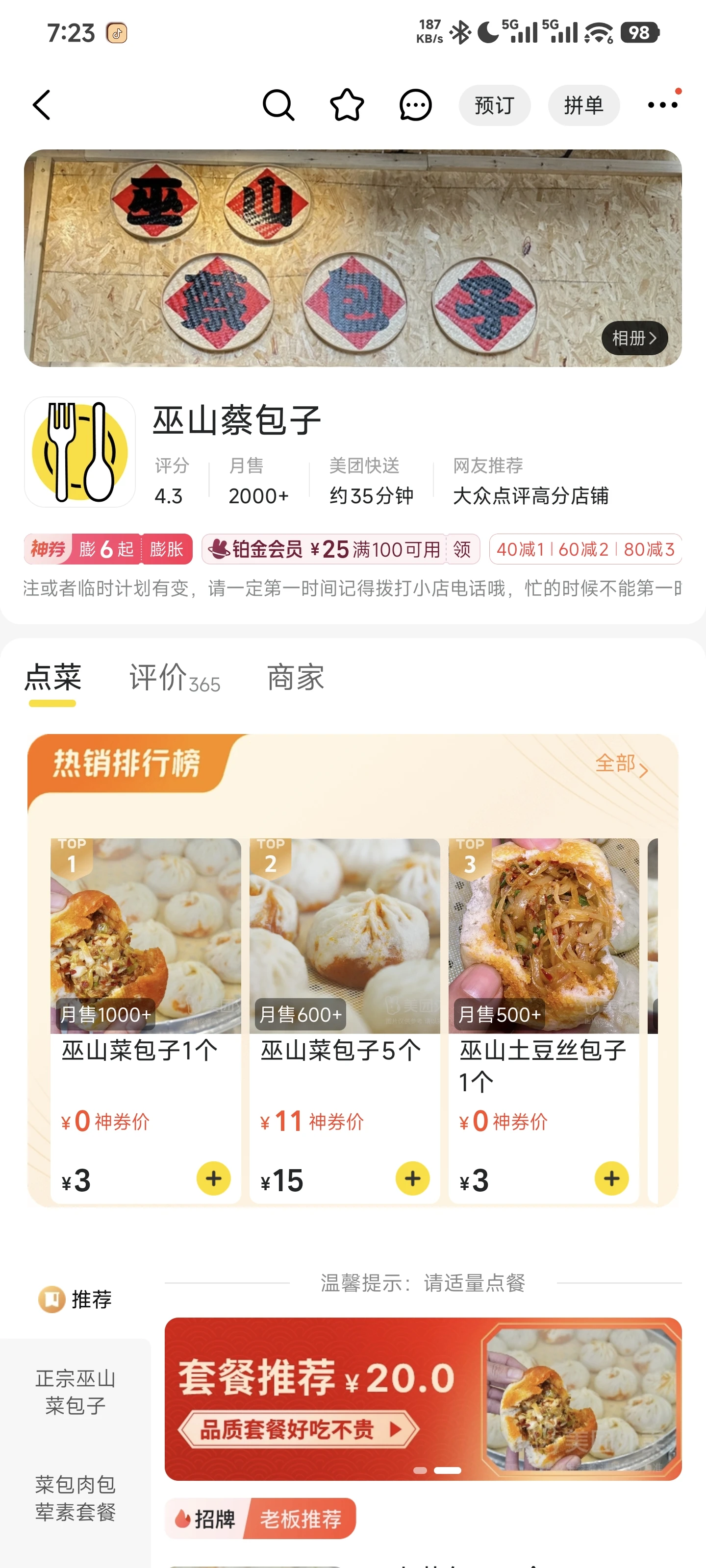 在表弟家睡醒后,表姐买了10包子。我一看我说重庆怎么有巫山包子啊,吃了下味道挺不错的。和自己在巫山吃的包子味道一模一样。就是价格贵了3块钱一个的包子,走的时候给妹儿买了十个平台优惠下来还是接近30块。味道是真不错。他哪儿销量我看了哈也挺不错的。在重庆早餐吃到最多的就是预制包子。太难吃了。这家店位置在两江体育公园,凯德广场那儿。离那儿附近很近的朋友可以去购买尝个鲜!