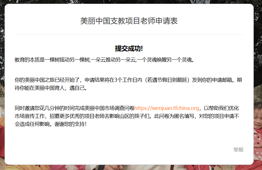 心中一直有个想法,就是想去祖国的深山、教育贫乏的地方,贡献自己的一份力量。现在也没有结婚、没有房贷车贷压力。刚刚提交了申请。看它能通过网申不。通过了就七月份开始去。学生遇到一个负责的老师,是真的能改变自己的人生。