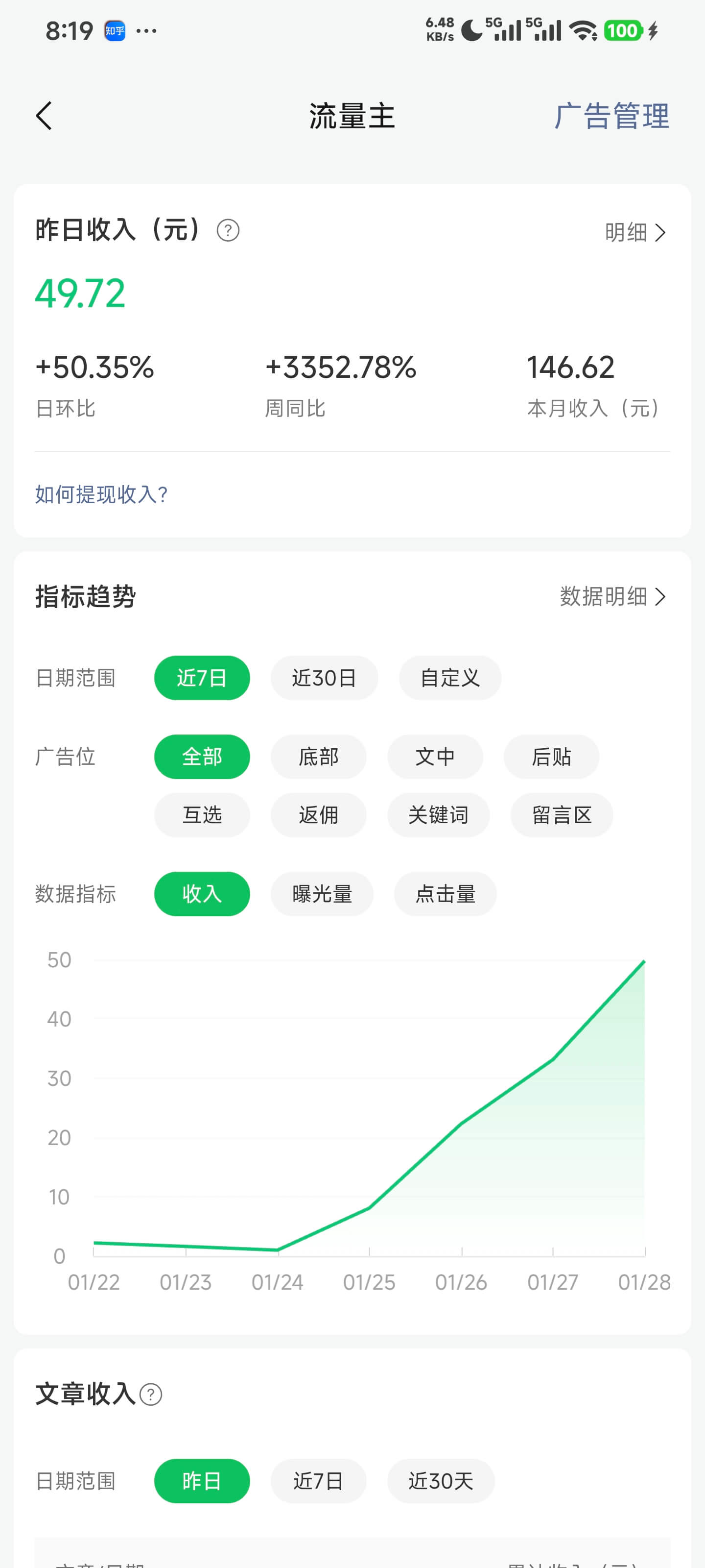 前天收入30多,昨天收入40多。微信公众号只要有流量,带来的收益还是可以的,看了下这个数据大概在一万多左右的阅读量带来广告有100多的收入,那种十万加爆款文章那就是1000左右,只是估计个大概。因为高粉丝的广告客单价可以比我们这个还要高些。把这个收入存着到时候当买手表的启动资金,哈哈哈😂