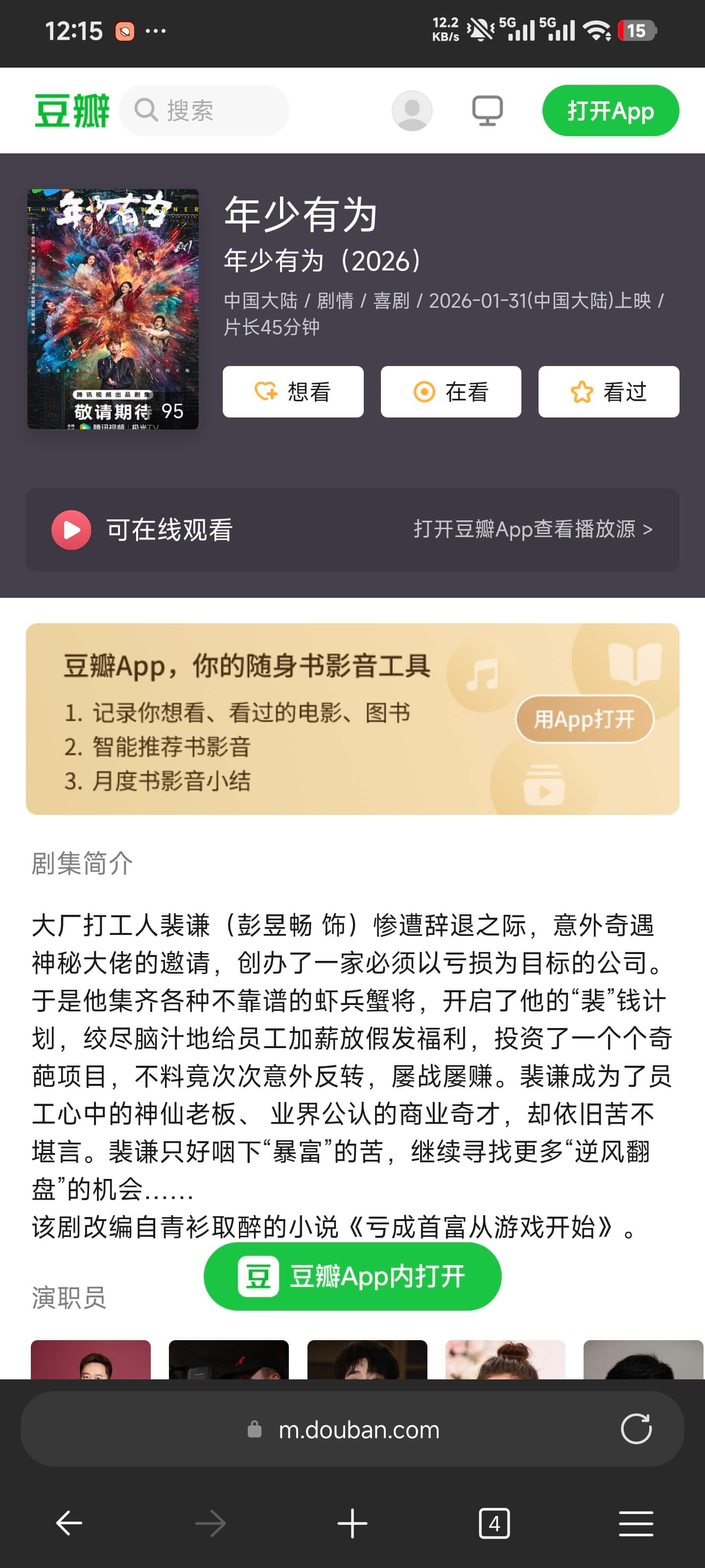 今天放假在家找电视看,看到了腾讯首页推荐的最新电视剧《年少有为》看到了第七季,后面还在更新。从第一集看到第七集挺不错的,说实话现实中真的有腾达这种公司吗?这个电视值得大家一看。 免责声明本站内容(教程、软件、资料等)仅供个人学习研究之用,严禁用于商业或非法目的,使用风险自负。博客部分内容来源自网络,版权归属原作者,本站不承担相关版权责任。请在试用下载后24小时内删除相关资源,支持正版。如涉及侵权,请通过邮件:gouweicaosheji#163.com与我联系处理。
