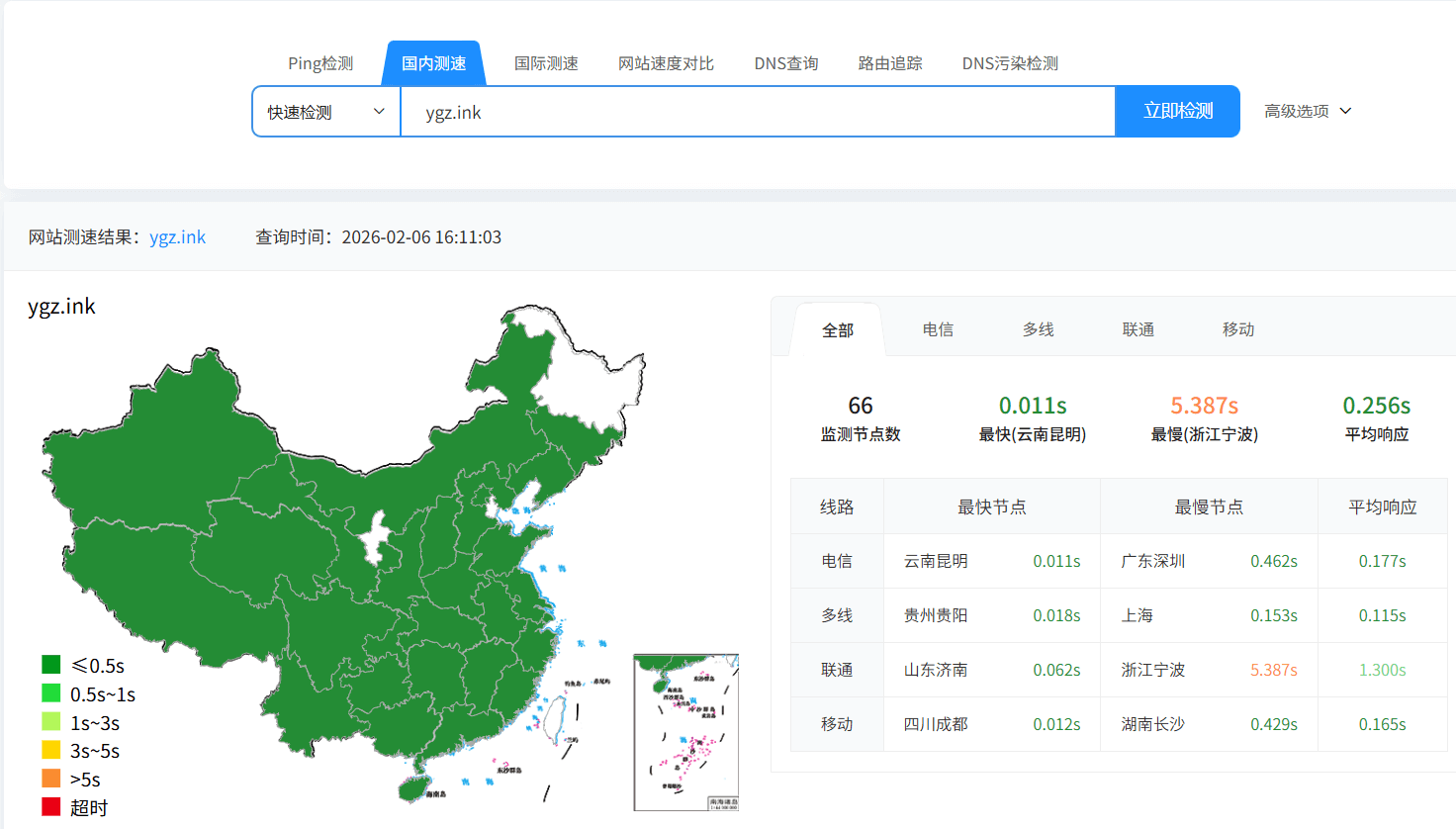 用上后测了下国内的速度,确实是很快啊一片绿色!
