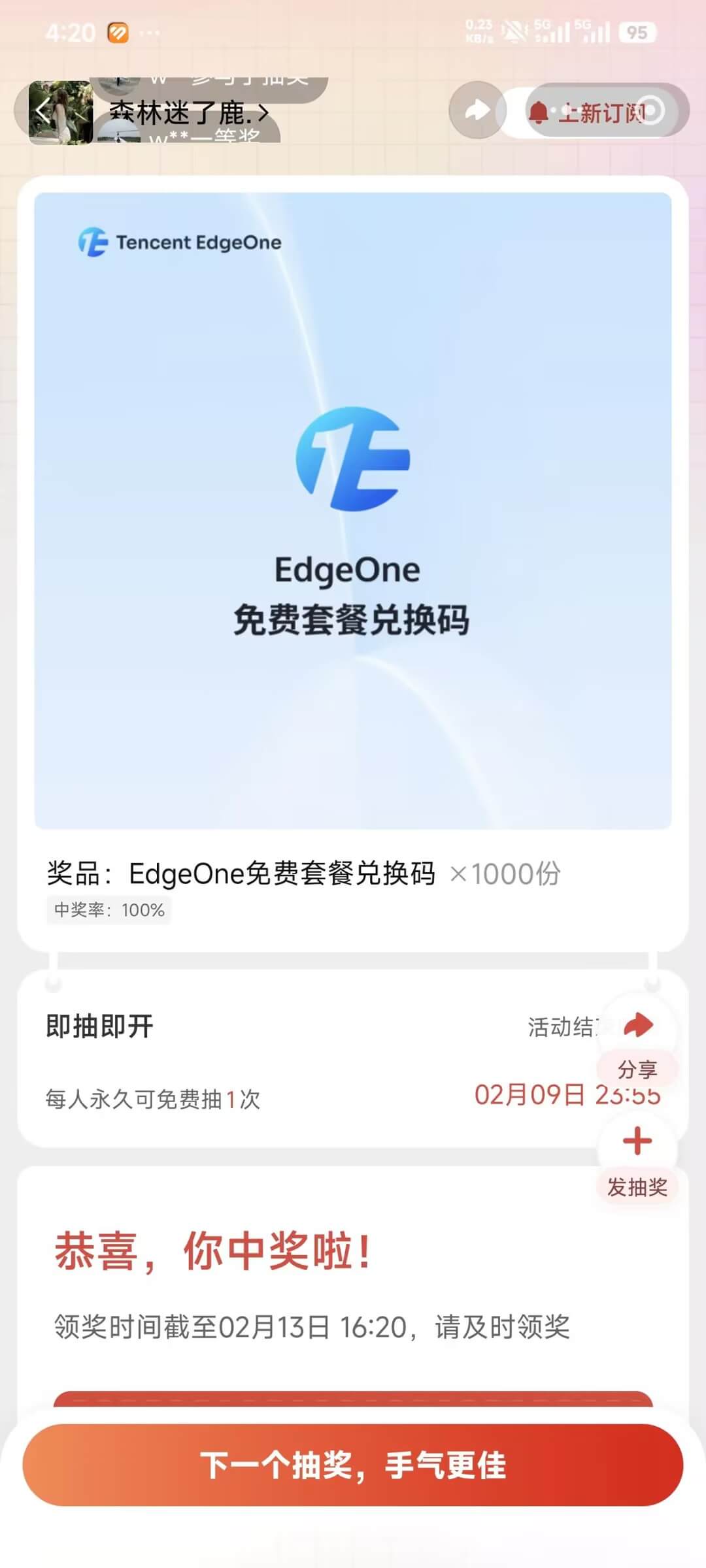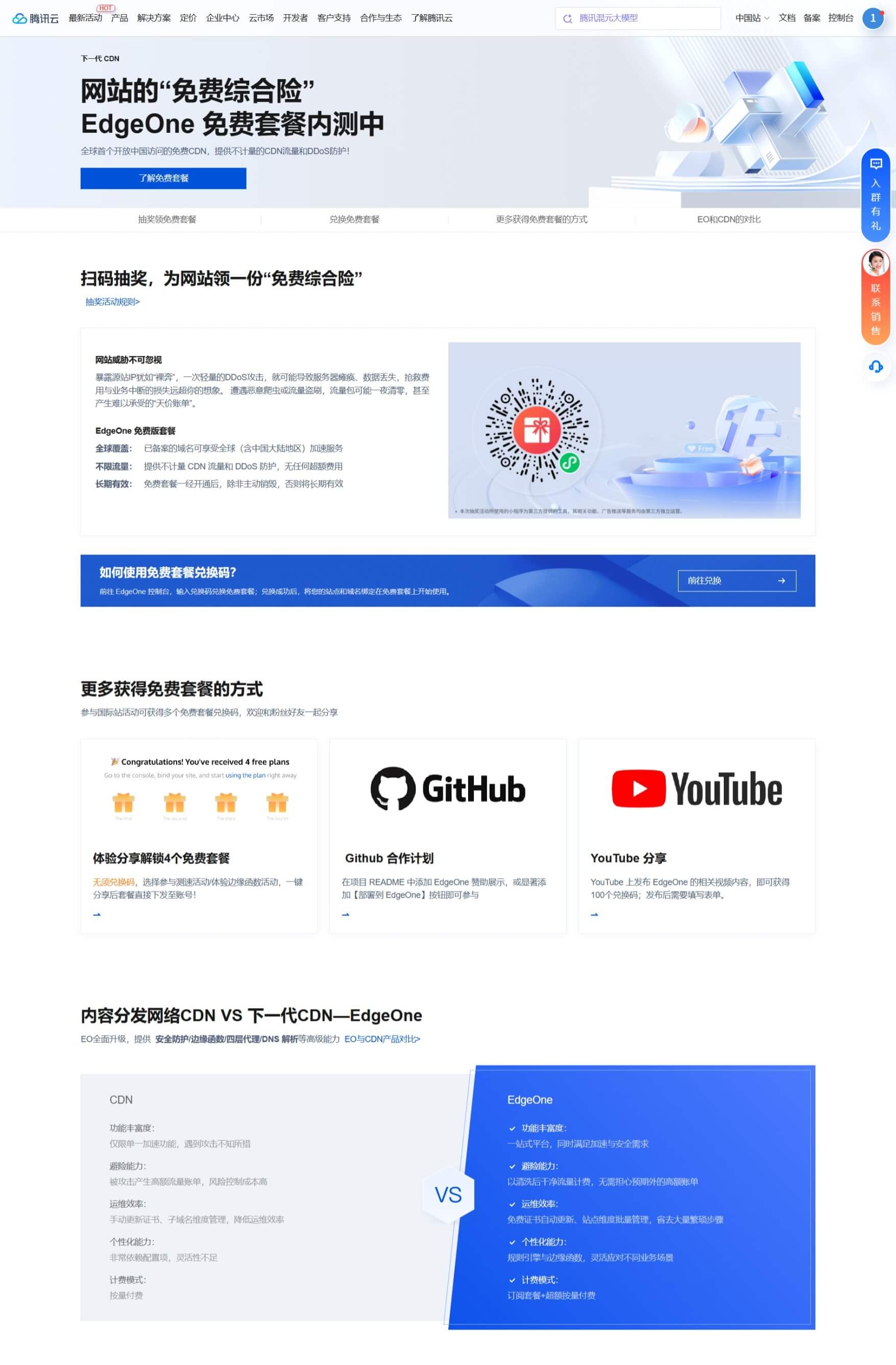 之前我在各大论坛都看到大佬们用上了腾讯的EdgeOne加速,那个时候需要去邀请人啊,发帖啊那些才能获得邀请码。就没有去捣鼓研究这个。近段时间在QQ群看到申请邀请码不需要发帖搞这些了,直接扫码抽内测码100%中,然后我就来试了下直接抽中,就来使用了下这个配置也很快,我域名刚好也在腾讯云直接使用的一键托管配置。简单的设置了下SSL证书,调整了下防护策略就可以了。大家直接去腾讯云搜索EdgeOne然后点击到这个页面,用微信扫页面的那个二维码就可以了。然后在页面上输入邀请码进行兑换。活动持续到2月9号。需要的大家可以去用用,加速效果挺不错的肉眼可见的快。