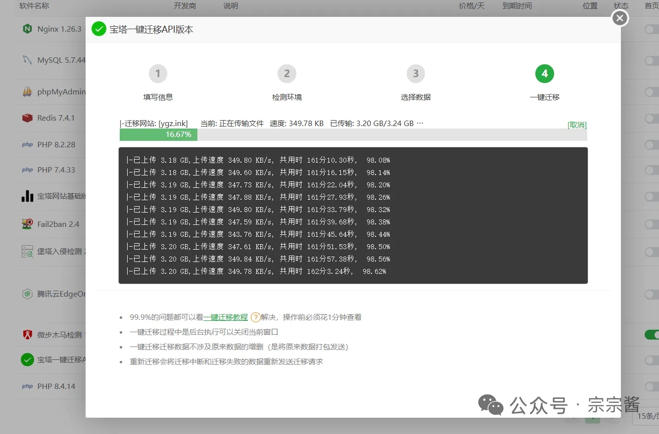 迁移过程挺顺利的,直接用宝塔的“一键迁移”功能,花了大概一个小时就把所有东西都搬过去了。之后简单配置了一下新服务器的环境,该开的端口、该设置的计划任务都弄好。