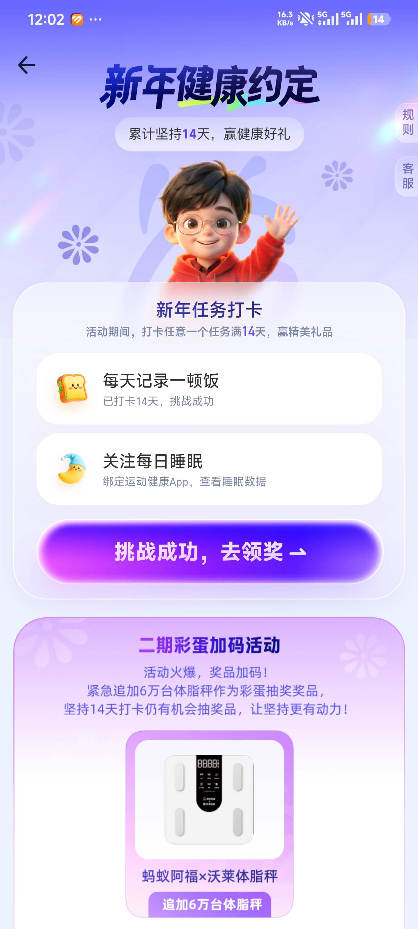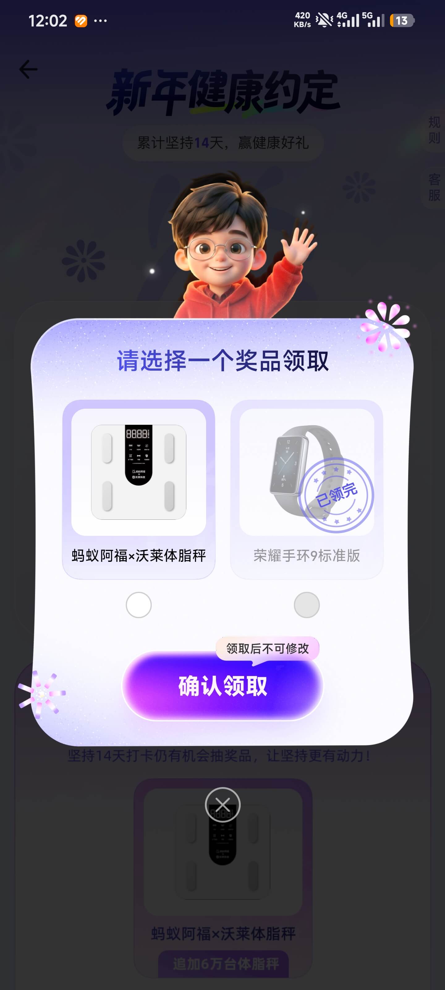 这个是过年前从2月6号开始的活动,从支付宝集福下载蚂蚁阿福第一波就可以领取16.8的线下支付红包,第二波就是这个连续打卡14天领取手环或者体脂秤。由于我参加的比较晚然后就错过了手环🥲!不过没关系有个称也不错!
