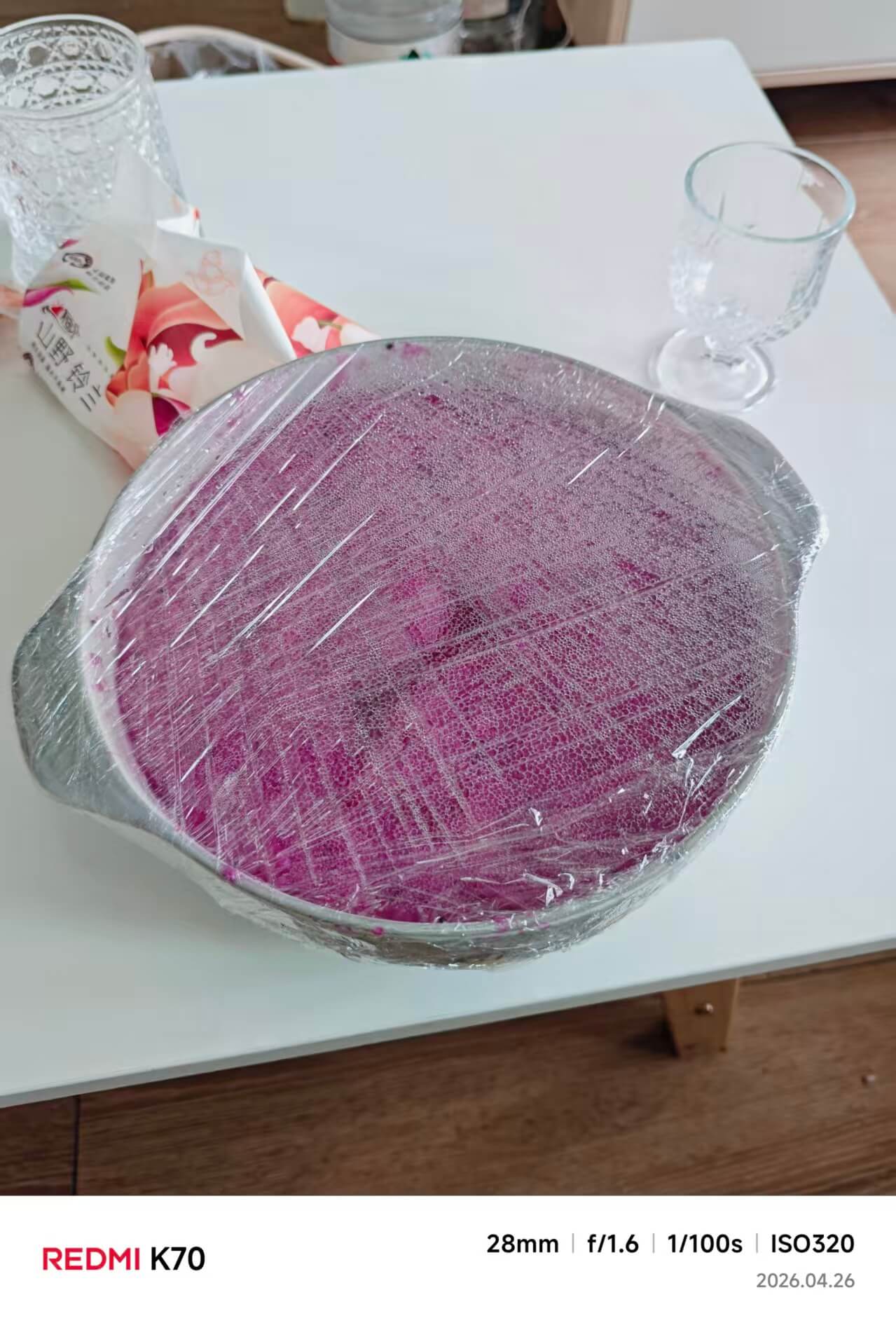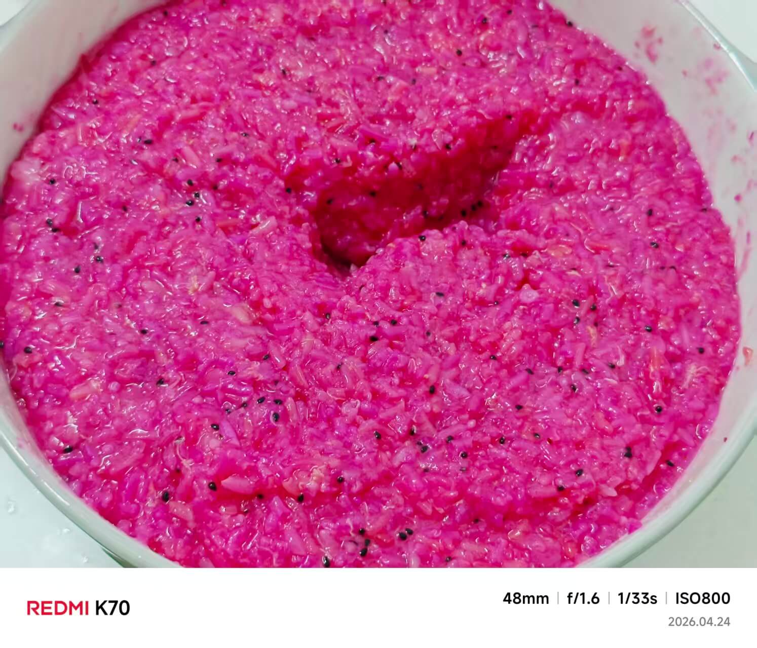 前些日子用五常大米做的醪糟还挺成功的。就想着跟网上学做火龙果醪糟试试。然后专门去超市买了一斤糯米,一个火龙果切好。然后糯米洗净后用电饭锅煮,煮到一半把火龙果放进去。煮好后把它们混在一起。然后放纯净水和酒曲,密封发酵两天。星期五晚上做的,今天打开一看长白毛了😟失败了😟