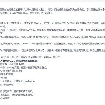 昨天打开“屌丝论坛”,看到了站长C发布的关站公告。他宣布将于2026年2月2日——论坛八周年之际,正式封存网站。 公告里,站长冷静地列出了几条关闭原因:对传统I…
