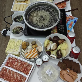 我们是四号放假,所以今天自己煮火锅儿吃,花费350块大洋。一个电磁炉➕锅花了150,菜花了200。主要是去的有点晚了,肉菜类都下架了!